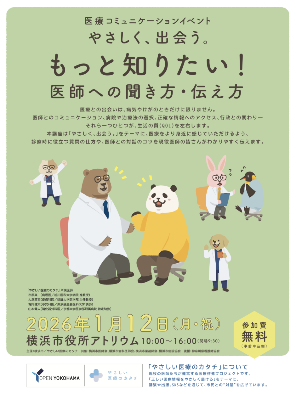 「やさしい医療のカタチ」は、2026年1月12日(月・祝)に、横浜市との共催による医療コミュニケーションイベント「やさしく、出会う。〜もっと知りたい!医師への聞き方・伝え方〜」を開催することをお知らせいたします。